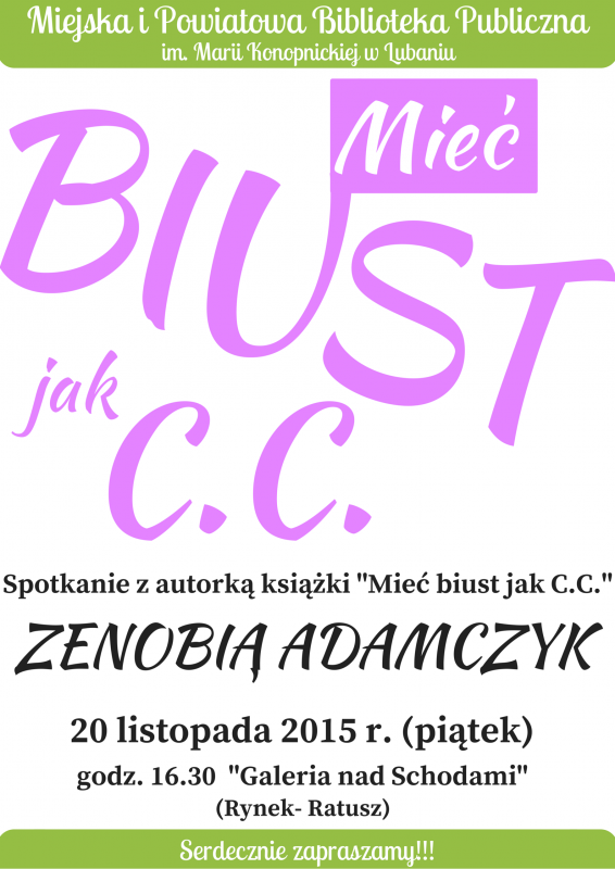 W Miejskiej i Powiatowej Bibliotece Publicznej w Lubaniu 20 listopada o godz. 16.30 w „Galerii nad Schodami” odbędzie się spotkanie z Zenobią Adamczyk, autorką książki „Mieć biust jak C.C.".