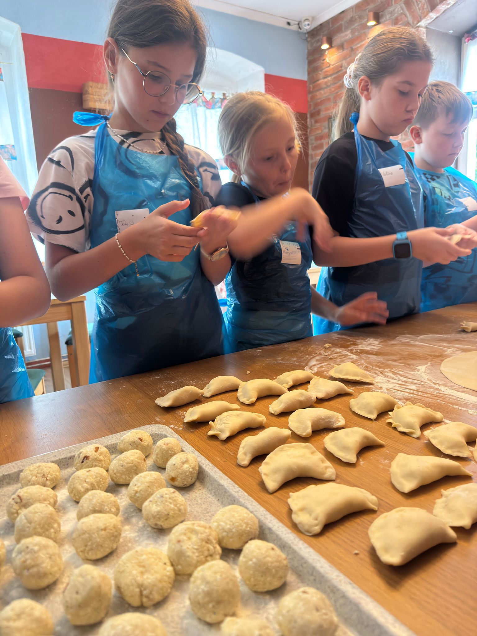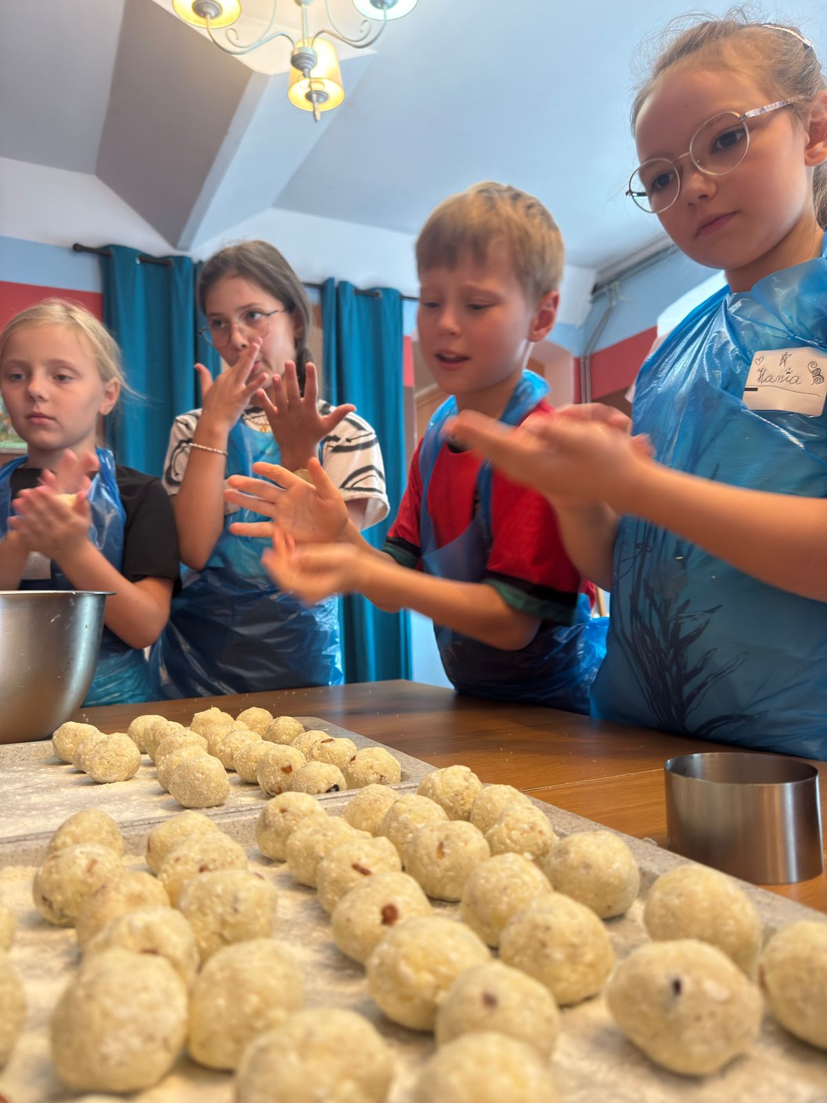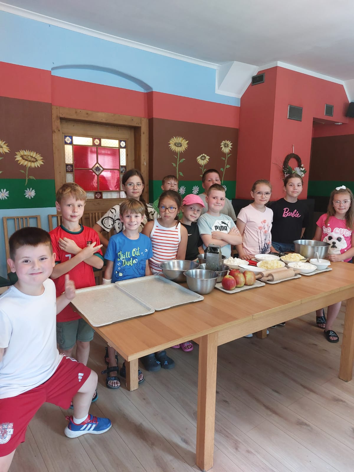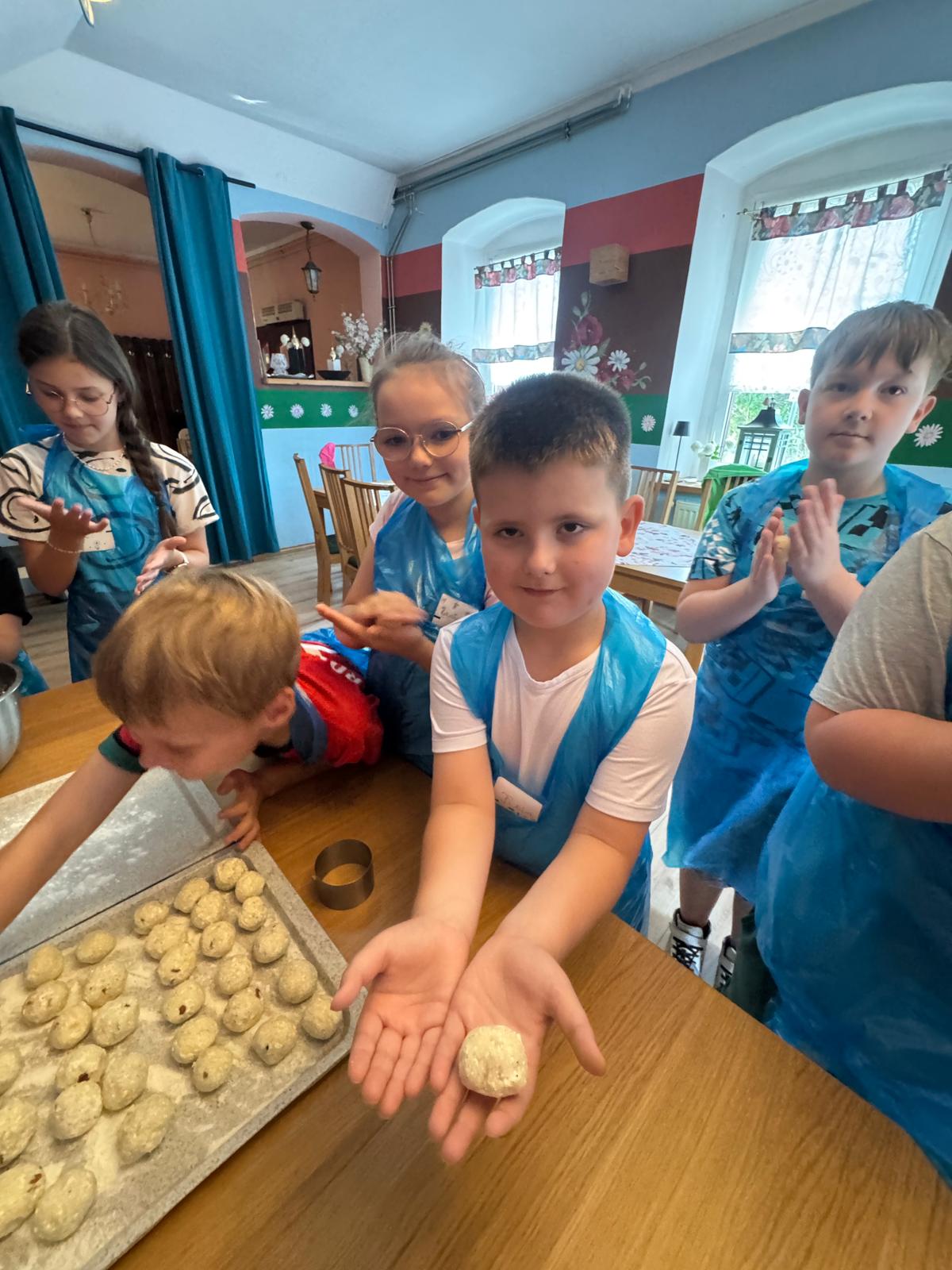 W ramach poszerzania wiedzy o tradycjach kulinarnych dzieci uczestniczące w wakacyjnych zajęciach w bibliotece 13 sierpnia 2025 r. wybrały się na warsztaty przygotowywania pierogów.
