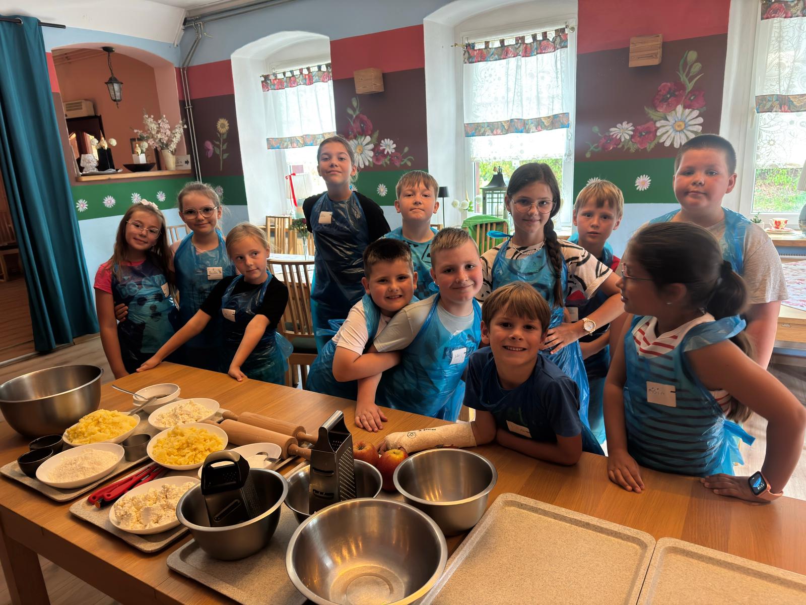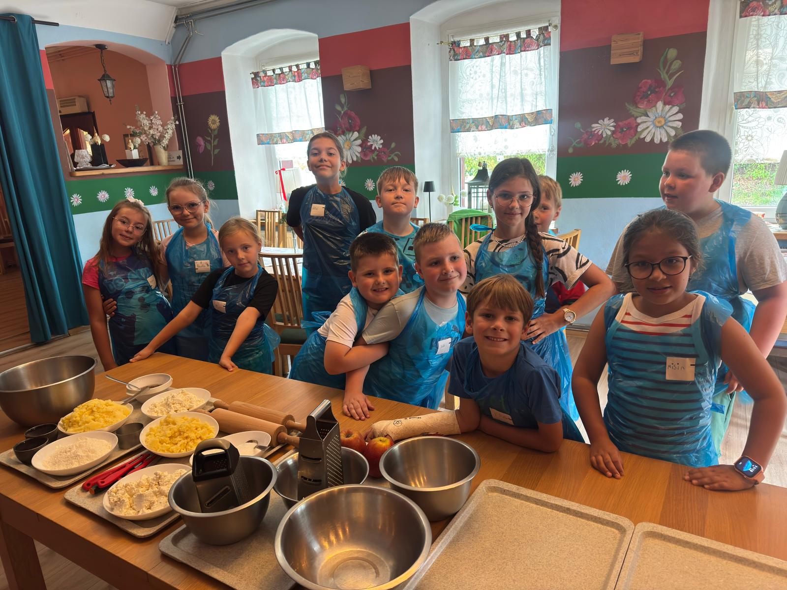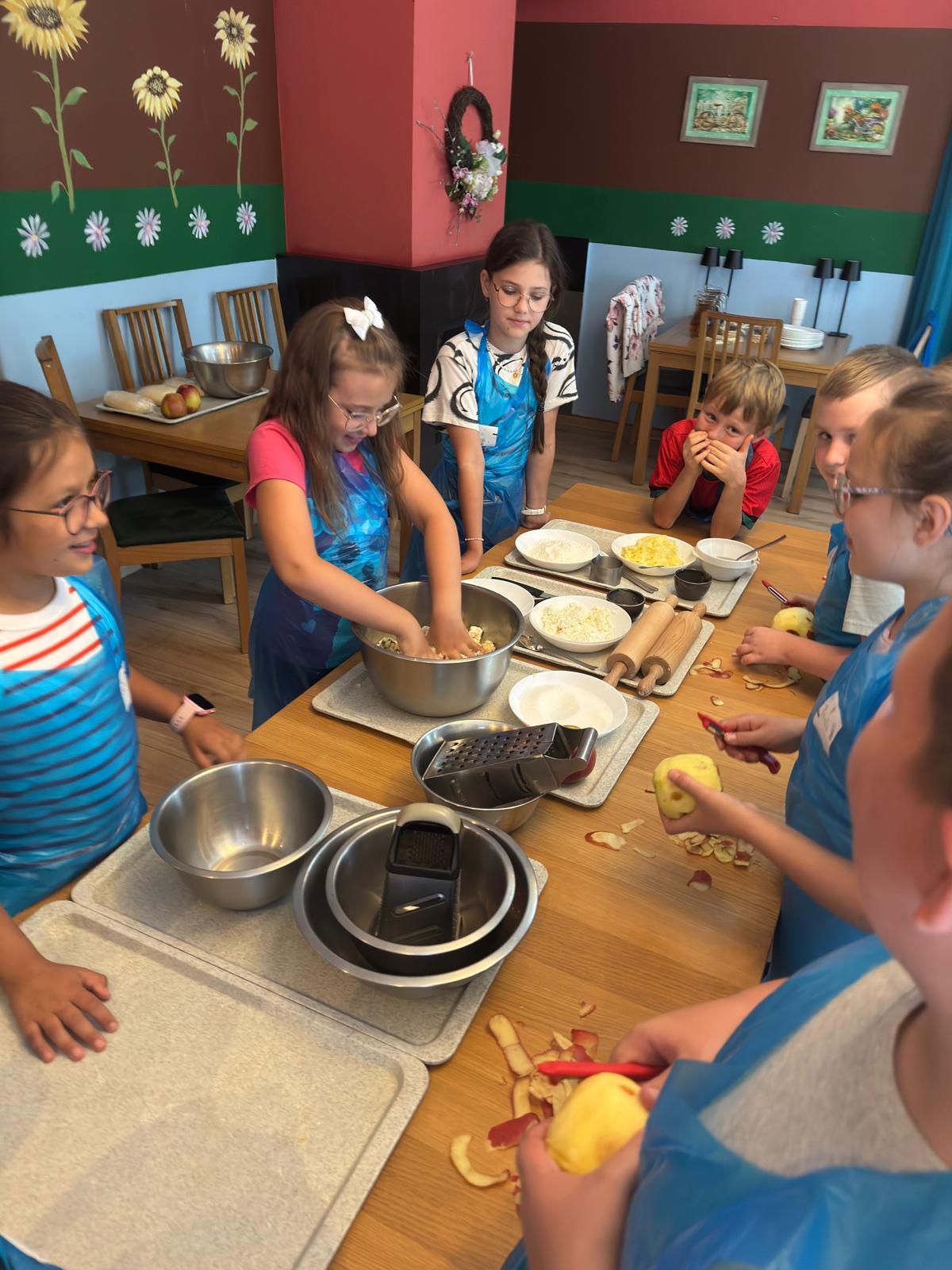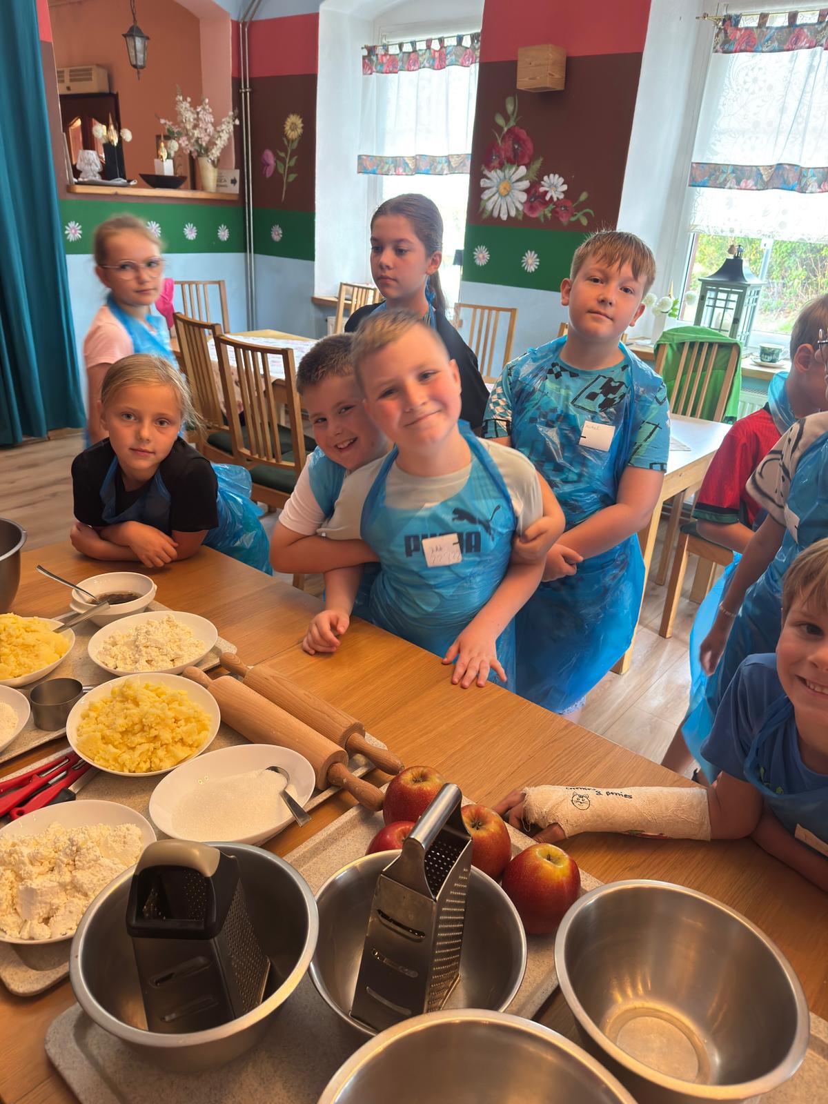 W ramach poszerzania wiedzy o tradycjach kulinarnych dzieci uczestniczące w wakacyjnych zajęciach w bibliotece 13 sierpnia 2025 r. wybrały się na warsztaty przygotowywania pierogów.