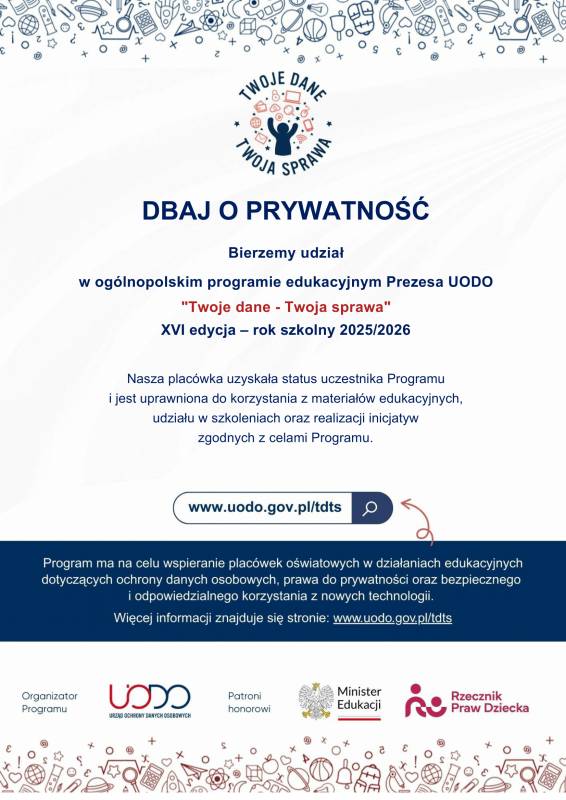 Nasza szkoła dołączyła do ogólnopolskiego programu edukacyjnego „Twoje dane – Twoja sprawa”, organizowanego przez Urząd Ochrony Danych Osobowych. To już XVI edycja tego wyjątkowego projektu, w którym biorą udział szkoły z całej Polski.