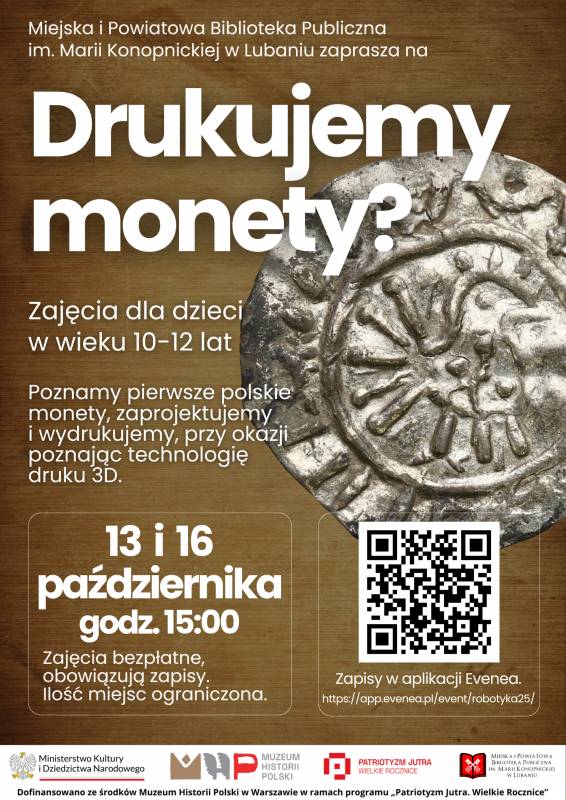 Miejska i Powiatowa Biblioteka Publiczna im. Marii Konopnickiej w Lubaniu zaprasza dzieci w wieku 10–12 lat na wyjątkowe warsztaty druku 3D połączone z poznawaniem historii pierwszych polskich monet.