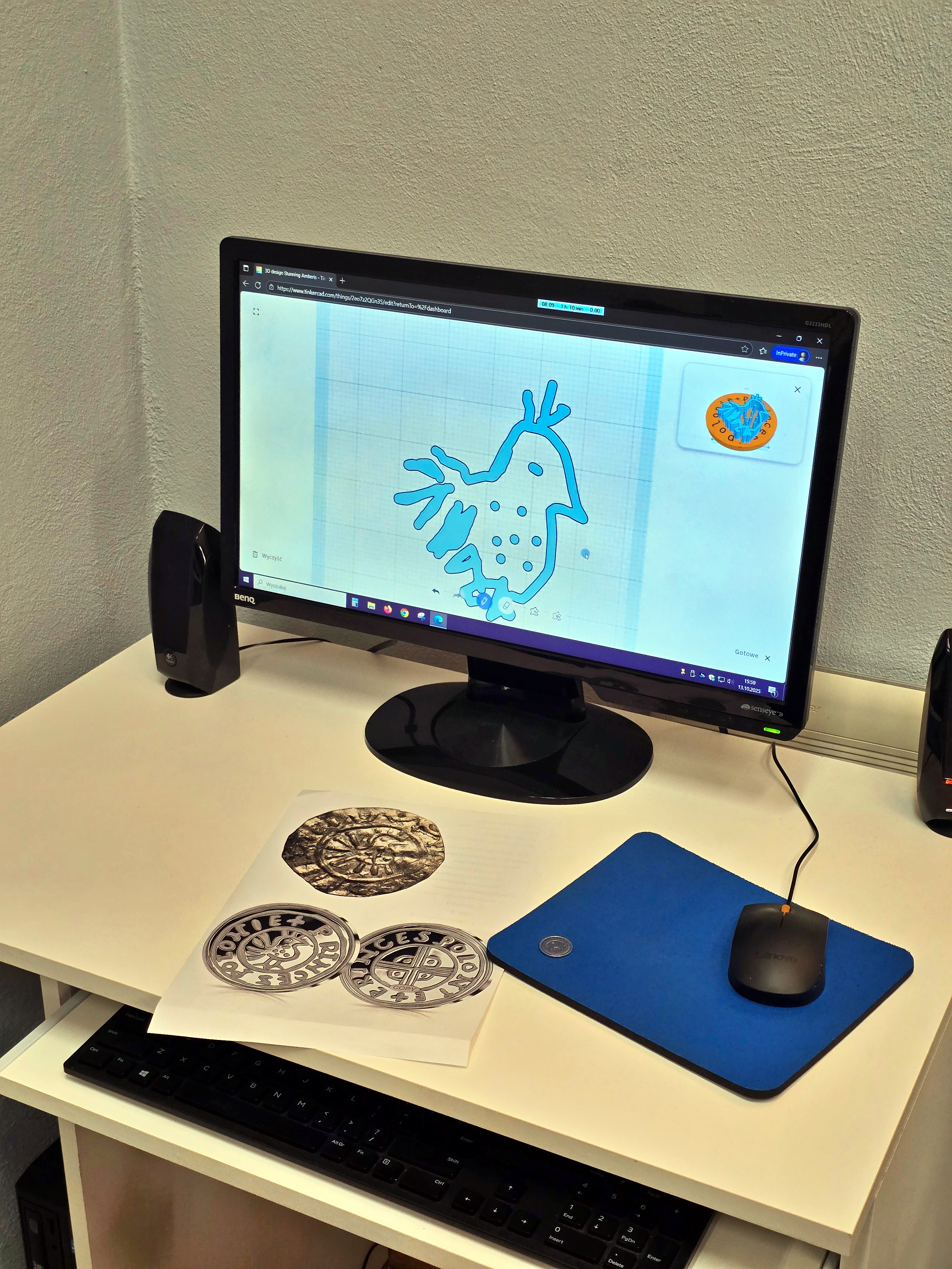Część praktyczna poświęcona była projektowaniu i drukowi 3D. Uczestnicy poznali proces przygotowania modeli do wydruku oraz elementy niezbędne do tworzenia trójwymiarowych obiektów. Z dużym skupieniem odwzorowywali detale monet w programach projektowych, co okazało się sporym wyzwaniem przy pierwszym kontakcie z drukiem 3D. Na drugich zajęciach dzieci dopracowywały własne projekty monet z autorskimi symbolami, napisami i wzorami, przygotowując je do późniejszego wydruku.