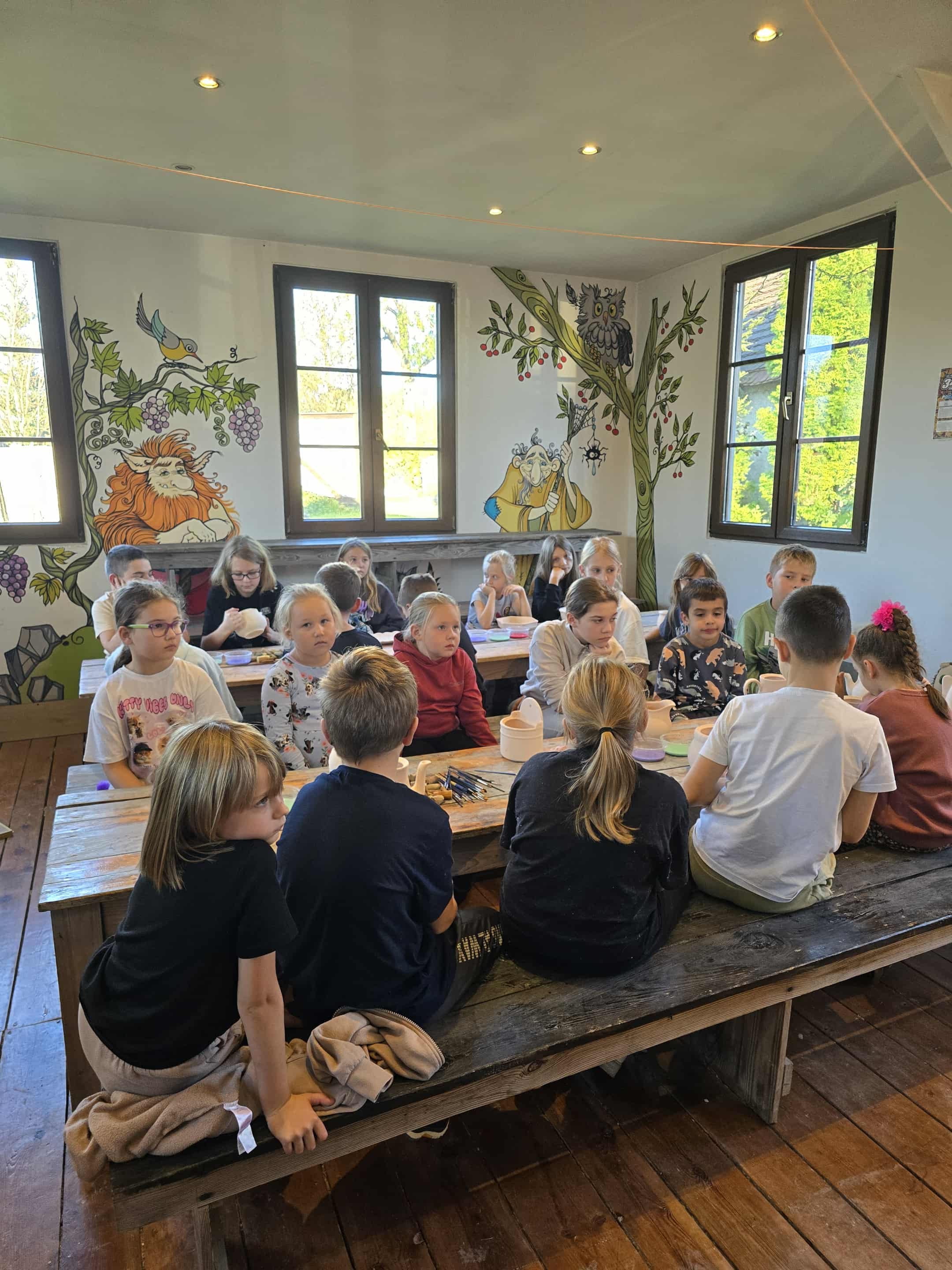 Na początku zajęć dzieci poznały fascynującą, ponad 600-letnią historię bolesławieckiej ceramiki, z której słynie nasz region. Dowiedziały się, czym jest glinka kaolinowa, powstała w okresie paleolitu, oraz jak przebiega cały proces tworzenia naczyń – od wydobycia surowca, poprzez formowanie, suszenie i wypalanie, aż po końcowe zdobienie. Uczestnicy z zainteresowaniem obserwowali, jak wiele precyzji, cierpliwości i kunsztu wymaga przygotowanie każdego elementu.