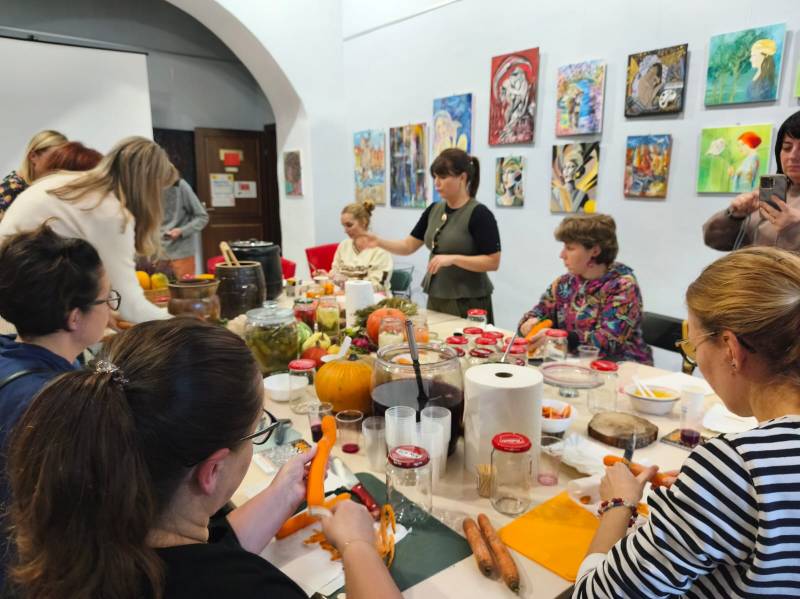 Nie zabrakło również części praktycznej – każdy z uczestników przygotował własny słoik z warzywami, eksperymentując z przyprawami i smakami. Wspólne kiszenie stało się okazją do rozmów, wymiany doświadczeń i rodzinnych przepisów przekazywanych z pokolenia na pokolenie.