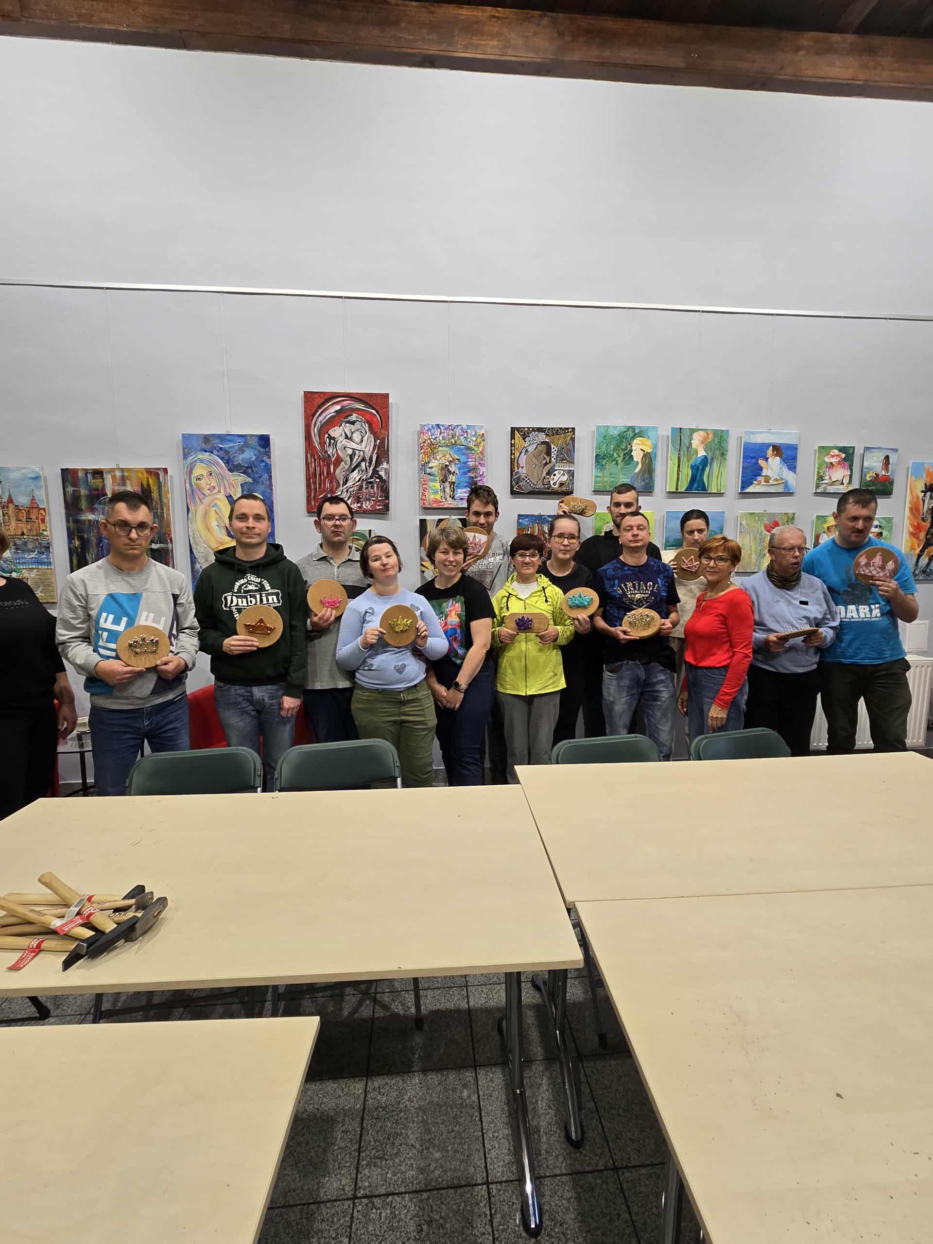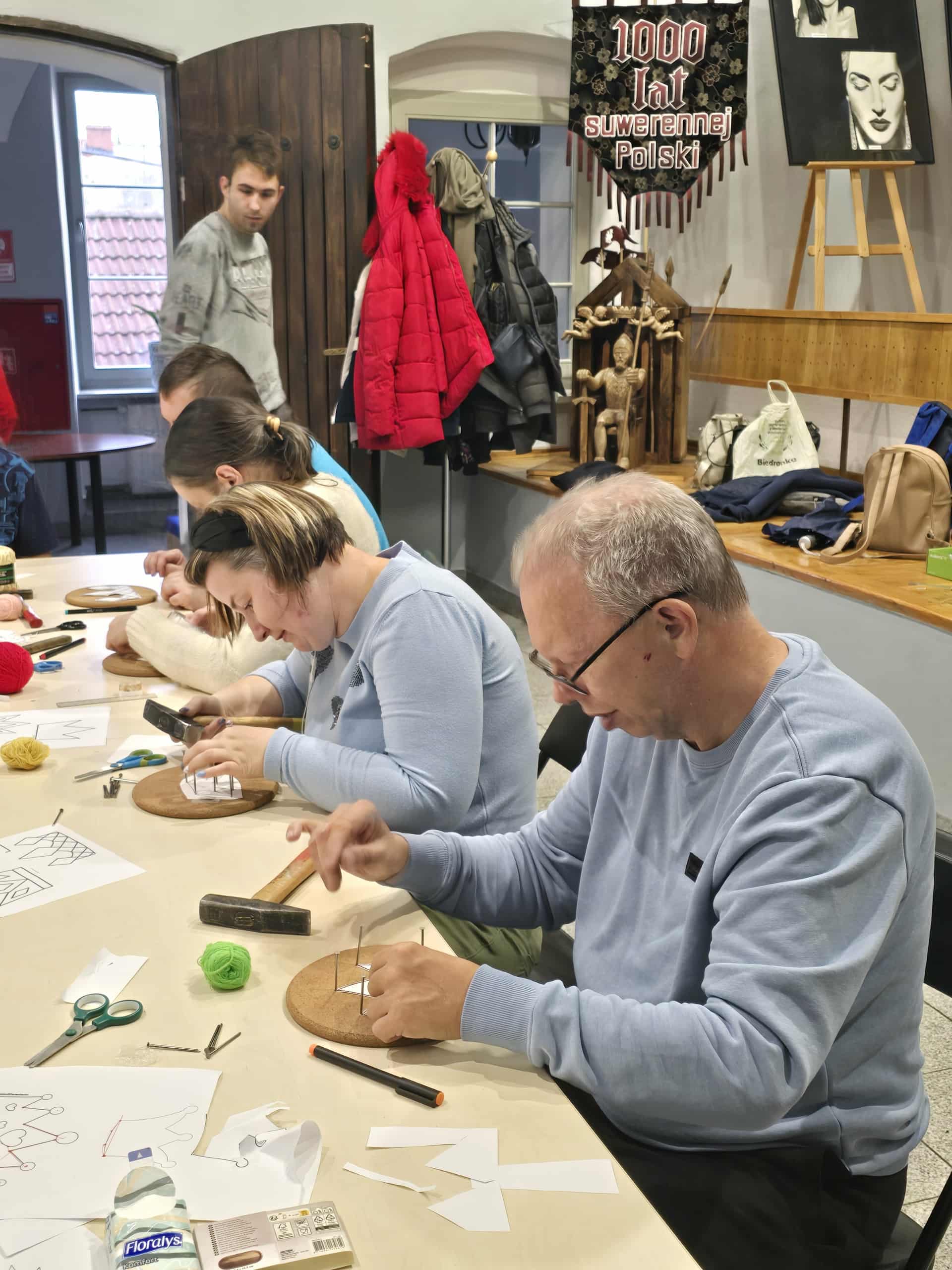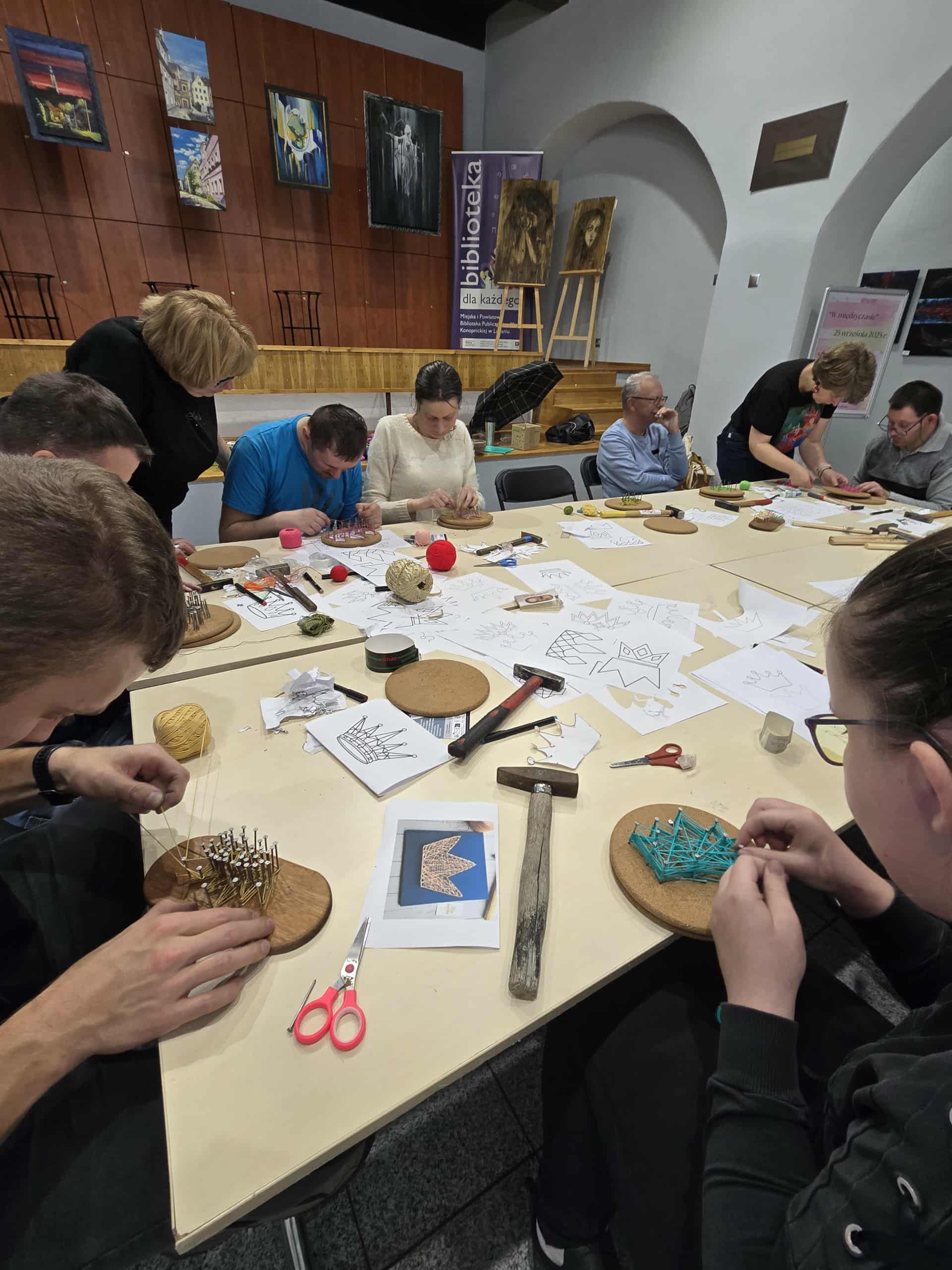 Podczas spotkania uczestnicy sięgnęli po gwoździe, młotki i kolorowe nici, by z ich pomocą stworzyć niezwykłe prace. Tematem przewodnim była korona Chrobrego – symbol siły i historii naszego kraju. Każdy z uczestników realizował własny pomysł, tworząc niepowtarzalne, pełne wyrazu kompozycje.